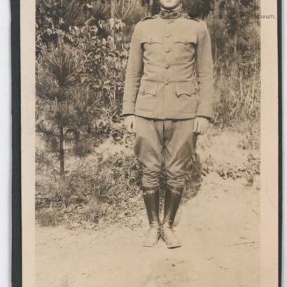 Update 1/2008: Sepia toned print of Will Buchanan, (First Lt. in W.W. I) in uniform standing on a dirt clearing with vegetation and trees behind him. His uniform is of high dark boots, jodhpur type pant. His jacket has five button closure with high neck collar with U.S. insignia on either side of front. Has front billed army type hat.