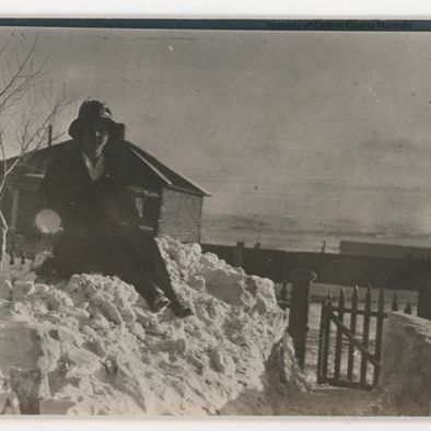 Black and white print. Snapshot. Image of a young woman seated on top of a large mound of snow. Shoveled walkway to gate with picket fence at right. Buildings and hills in background. Woman is dressed in dark coat and hat. Image dark.