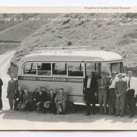 Update March 2011: Black & white print. A print card. Image of a small bus which has written on the side: "Seminoe Transportation Company Rawlins Parco and Seminoe Dam" Fourteen men are standing or kneeling beside the bus. It sits on a dirt road which curves around hills. Printed in white on original negative: "Rawlins C. C. trip Seminoe and Alcova Projects 9-20-35 Meyers Photo"