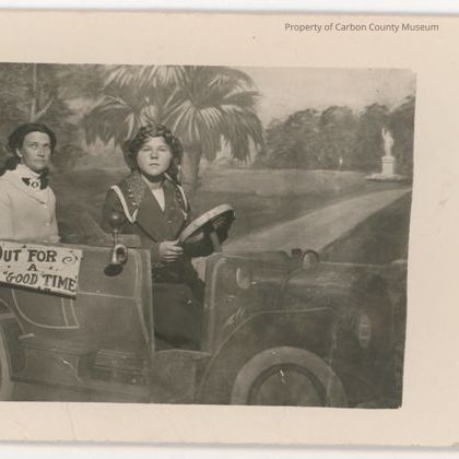 Update 2009: Black and white print. Studio portrait. Printed on postcard paper. Printed off center to the left. Full length portrait of two young women posed in a prop automobile in front of a painted backdrop. Sign on automobile: "Out for a Good Time." Girl in front driver's seat is dressed in dark coat with patterned and fringed collar and wide lapels. her hair is braided on top of her head and there is a very large bow at back of her head. Girl in back seat is dressed in light-colored sweater, light blouse with dark bow at neck; her hair is pulled back.