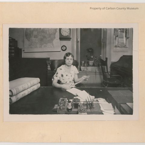 Update 1/2008: Black and white print 5 x 7" mounted on ivory colored acid matboard. Photo shows Linda Buchanan Felton sitting at a large desk in an office. She has short wavy hair with a pin curl on left forehead. She is holding a long sheet of paper in her hands. She is wearing a ruffled dress with cherries? printed on withe background fabric. She is wearing wirerim glasses. On her desk are two large commissioners Records ledger books. In forefront of desk are inkwells and ink pens. Background window with plants, calendars on wall, roll top desk to right, a wall map and files.