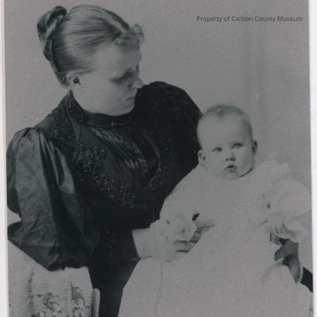 Black & white copy print of a woman holding an infant. Woman has her hair pulled back & pinned in a loose bun & wears a dark ornate dress. The infant has on a light colored long gown.
