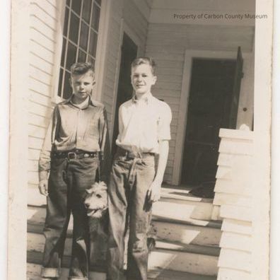 Update 2009: Black and white print. Snapshot. Image of two boys and a dog standing on the steps of a house. Boys are dressed in casual clothes. Dog is sticking his head between the boys just below hip level. Porch, doors and side of house in background.