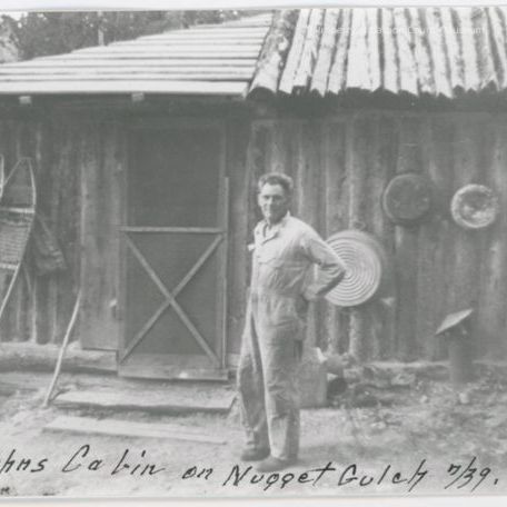 Black & white snapshot copy print of man standing in front of a vertical slab sided building. On the side hangs a washtub & two smaller dish pans & leaning against cabin on other side of a screen door are snow shoes. Man is wearing coveralls & has his left hand on his hip. Printed on bottom on original: "Johns Cabin on Nugget Gulch 7/39"