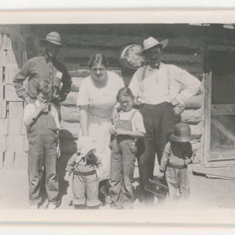 Update 2009: Black and white print of two men, one woman and four children. Man on photo left has on a large brimmed hat, dark shirt, print tie. Has hands on his hips. Lady in middle is wearing a light colored striped dress. She is leaning forward with her arm extended behind a small child. Man on photo right has on a large light colored straw hat, white shirt, dark pants and suspenders. Boy on front left has on bib overalls, light shirt, and glasses. Small child standing in front of woman, has on a light colored large brimmed bonnet. Next child in line has on bib overalls and light colored shirt, hair pulled back and wearing glasses. Small child standing in front of woman, has on a light colored large brimmed bonnet. Next child in line has on bib overalls and light colored shirt, hair pulled back and wearing glasses. Last child has mining hat and holds handle of box in his right hand. They are standing in front of log structure.