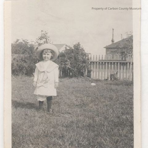 Update 2009: Black and white print of small child standing in a grassy yard. He is wearing a large hat with brim folded back away from face, white dress with sailor scarf tied in front, another tie at waist, dark tights and shoes. there is a picket fence in background with bushes growing on fence. Stone building in back ground.