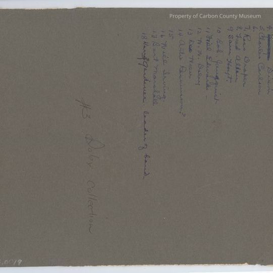 On back written in blue ink: "1. Bob Rasmusson, 2. Jim Healy, 3. Jack Nagle, 4. Dixon, 5. Charlie Carslon, 6. , 7. Ross Draper, 8. Fred Allen, 9. Sam Hoyt, 10. Bob Jungquist, 11. Will Edwards, 12. W.W. Daley, 13. Dee Wren, 14. Artie Rasmusson?, 16. Will Irving, 17. Bert Marshall, 18. Harry Gardiner-leader of band" Written in black ink: "Daley collection:. Written in blue in on emulsion surface identified # on each man.