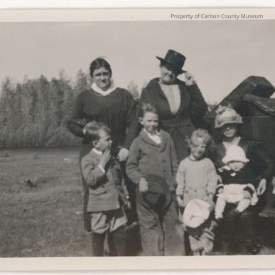 Update 2009: Black and white print of a group of three women and five children. Ladies dressed in dark heavy dresses, two have on hats. Two women standing beside a vintage care with luggage propped behind seat. One lady holding an infant is seated on running board. To her left is child seated with feet on running board . Three other children are standing in front, one holding a hat down in front of him with his right hand. Wind appears to be blowing.