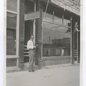 update 1/2008: Black and white print. Dr. Barber is standing just off the step to the door of his office. Dr. Barber is wearing a white shirt with no jacket, but does have on a tie, light colored slacks, and dark shoes. he seems to be holding a cap in his left hand. His office sign is half way up the left door frame of his office. To the right of Dr. Barber's office is F.E. Froling Shoe Store. Under the big picture window of Froling Store is a sign that reads "Boots and Shoes Made, Fine Repair." The street seems to be empty. To the left of Dr. Barber door is the window to his office.