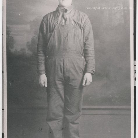 Black & white studio portrait copy of a standing man. He is wearing overalls & a dark shirt & cap with lace up boots. Studio prop of outdoor scene behind him.