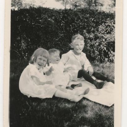 Update 2009: Black and white print of a young girl, young boy and toddler all dressed in white clothing sitting on a white cover in a grassy yard with shrubs and trees behind them. The boy is wearing dark socks and shoes. The girl has white socks and shoes. Her hair is short with bangs and ringlets on sides.