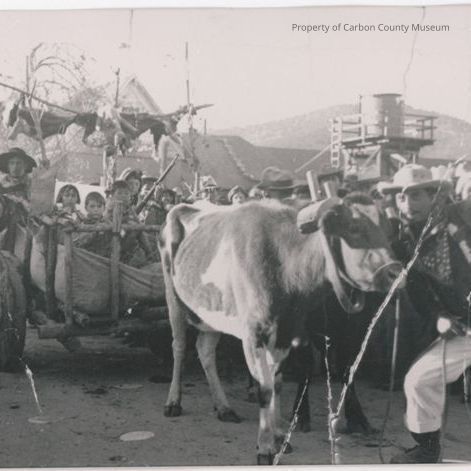 Two black & white copy prints. Image of a cow pulling a cart loaded with children. Cart has wood wheels, wood frame with cloth up sides & on bottom. A man is leaning with knees bent, next to the cow with a pole in his right hand. The cow has a wood yoke around it's neck. People are in the background & on photo right. A tower with a tank atop is on photo right & poles with hides draped over them on photo left. Roof tops & a hill are in upper background.