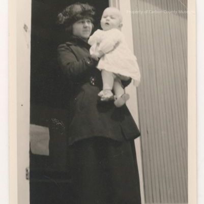 Update 2009. Black and white print. Snapshot. Image of a woman standing in a doorway holding an infant. woman is dressed in dark skirt dress, coat and hat. Infant is in a white dress, tights and shoes.