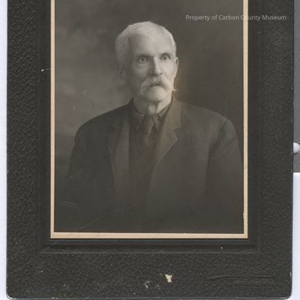Update 2008: Black and white print. Studio portrait. Mounted on black matboard. Head and shoulders image of a man dressed in dark 3-piece suit with dark shirt and dark tie. Man has short grey hair and mustache. Painted backdrop behind. Engraved in the lower right corner of mat: "the Ferris Studio Rawlins, Wyo"