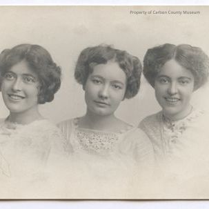 Update 2008: Black and white print, 3 3/4 x 5 5/8, of head and shoulder portrait of three young ladies in a horizontal row, each with dark short hair parted in center and curled. They all have dark eyes and are wearing light colored dresses. Girls on left and right have wide smile with teeth showing. Girl in center has a more serious look. Her dress neck edge has intricate lace inset with pintucks to either side. Girl on left has dress neck with three tiny bows in a vertical row. Girl on far right has lace insert on left shoulder view and embroidery on right neck edge. She is wearing a short chain with a cross hanging at center front.