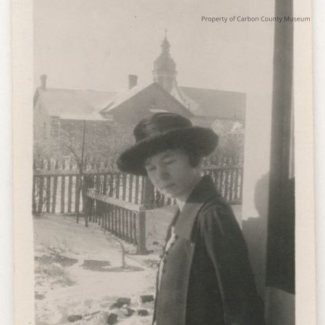Linda Felton in backyard of family home on 122 West Pine, Rawlins, 1917-1918. Catholic Church in background.