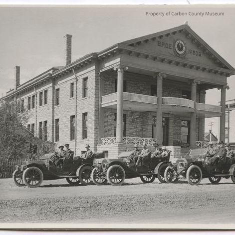 Update 2008: Black and white print attached to medium gray matboard of a large two story sandstone building with four large Grecian columns on the front wide porch supporting a second stroy open short white railing fenced terrace porch which overhangs the lower level porch and entryway. On building front at apex of roof beneath the top eaves is a large circular clock with wheat sheaths surrounding bottom and upper sides of outer edges of clock. Hands show 11:00 o'clock. to left of clock are large letters affixed to building: B.P.O.E. and to right of clock are letters and numbers: No. 609. There are two windows seen on building front. One on left and right of wide entry door. There are hansoms above these tall windows and the door. Ornate support brackets are positioned underneath eaves of roof edges sides and front and upper secondary eaves over second story terrace roof. In front of the building on the dirt street are three dark colored vintage open roofed automobiles all with light colored trees and side running boards. left to right: Car one has two men with hats in front seat and a single man in backseat. Car two has two men wearing hats and suits in front seat who are smoking cigars and a man wearing a hat with a cigar? in his mouth and his left arm around the back of the child seated next to him. The third car has two men in front seat, both wearing suits and hats. A man wearing a bowler type hat, cigar in his mouth seated next to a hatted child who is scrunched down in the seat. To rear of this last vehicle is a side street with the Ferris Hotel Bar sign seen in building window in background. There is a small house to left of BPOE. building that is obstructed by trees. Two little boys are standing outside picket fence watching the cars. Engraved stamp on bottom right corner "The Ferris Studio, Rawlins, Wyo."