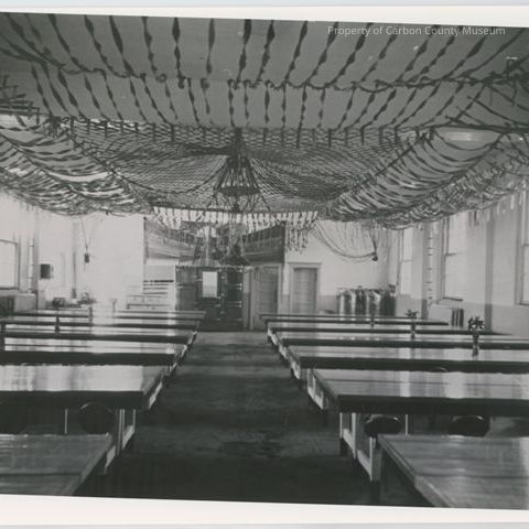 Black & white print. Snapshot. Image of a large room with long tables arranged in rows along either side. Doors along back wall; windows along each side. Crepe-paper streamers hang from ceiling & light fixtures. Vases with flowers on each table.