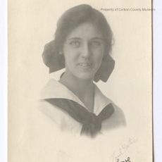 Update 2008: Black and white print of a young girl with dark hair pulled back with an oversize dark bow showing side left and right from behind her head. She has light colored eyes and dark eyebrows. She is smiling. She has a white sailor shirt on with dark colored tie under wide collar and tied in a knot at center front edge.