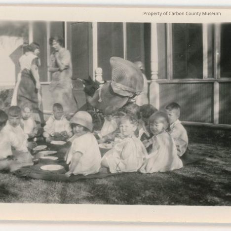 Update 2009: Black and white print showing a group of 10 children seated on a dark cover on a grassy lawn with white plates on the cover of there front sides. They are seated in a circle and most are turned looking at camera. A large wicker buggy is seen in back of the children with two women in long dresses standing on porch by screen door. Part of the house seen in background shows six tall screen windows and slat board siding underneath the windows.