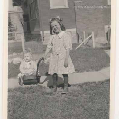 Update 2009: Black and white print of a young girl dressed in a patterned dress with dark stockings, black side button boots with medium hair in ringlets. She is holding onto a small riding pull toy that has a toddler aged child seated in it. A darker framed house is seen in the background. A grassy lawn is in foreground.