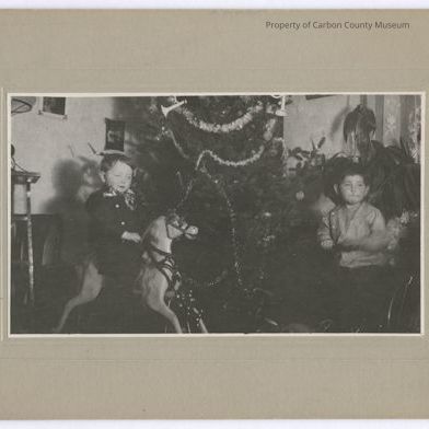 Update 2008: Black and white print attached to ecru colored matboard of two small boys with a decorated Christmas tree between them. Boy on left is wearing a dark jacket that buttons on side and fancy decorative scarf tied around his neck. He is riding on a light colored toy bouncing horse with headstall and other fear attached. The boy to right is standing? on a scooter with his hands placed on handle. A tiny wheel is seen on photo edge. A large rubber plant is behind him. He has dark hair and wearing a medium color shirt and dark pants. Tree has lots of rope tinsel and two toy horns are seen hanging down at top edge or tree.