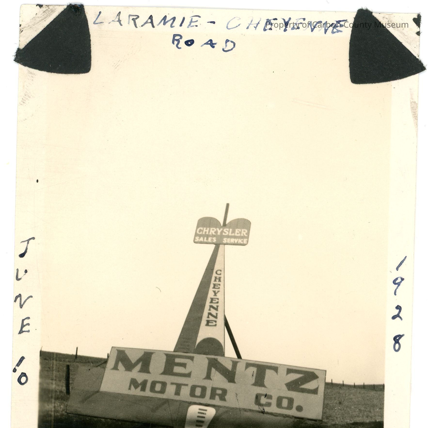 Black and white photograph. A roadside sign in three sections. The top section reads "CHTYSLER SALES SERVICE", the middle section is written vertically "CHEYENNA", and the bottom section reads "MENTZ MOTOT CO." Written along the top edge of the photograph is "LARAMIE - CHEYENNE ROAD", along the bottom "SIGN BOARD", vertically along the left "JUNE 10", vertically along the right "1928". The number 14 is printed on the reverse.Collection