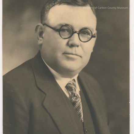 Update - March 2010: Black & white studio portrait print of a man with short dark hair wearing a dark jacket, vest, patterned tie, & white shirt. He is wearing black rimmed glasses. The dark short hair is parted at his side left.
