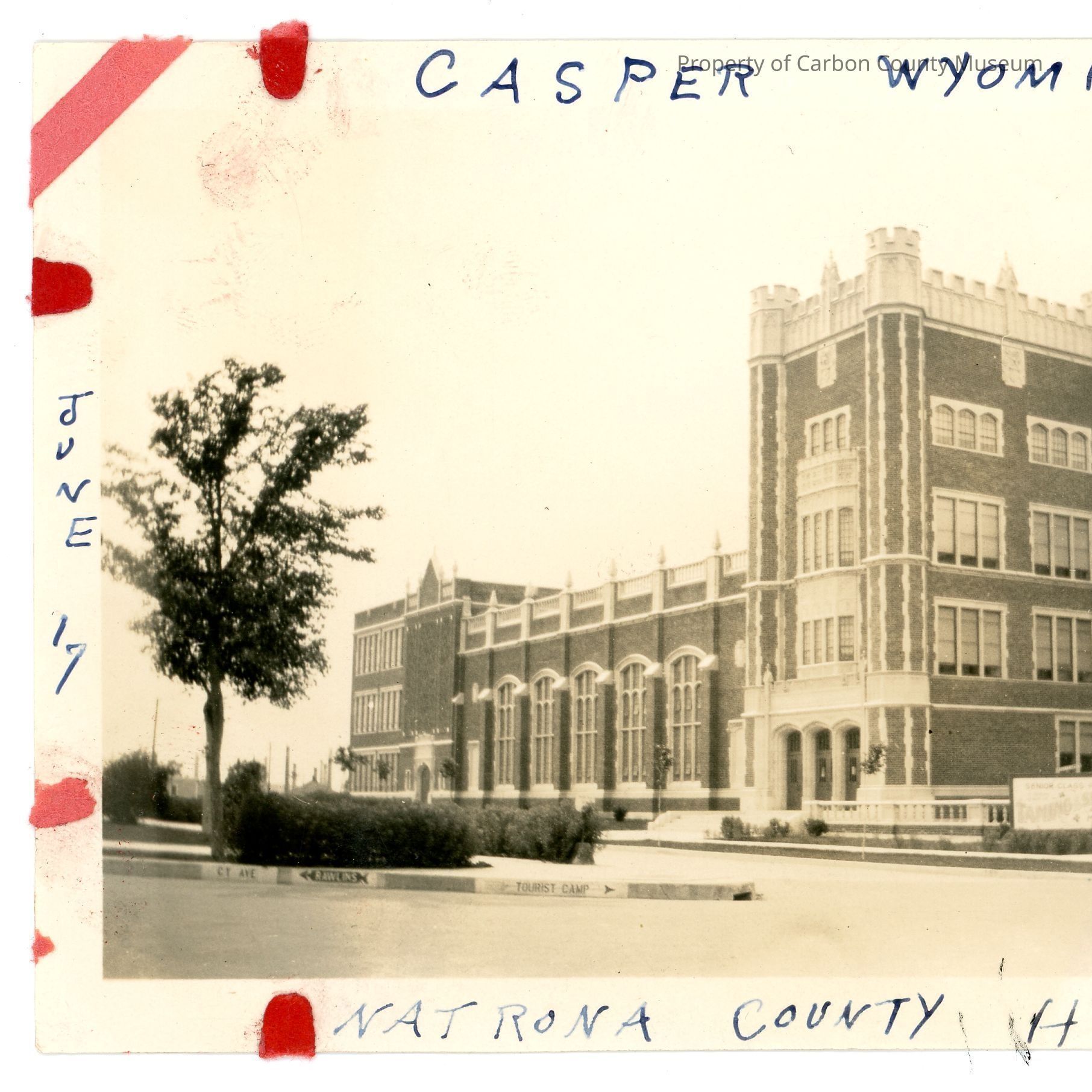 Sepia tone photograph. A large, three story brick building, a tree is present in the foreground. Written along the top edge of the photograph is "CASPER WYOMING", along the bottom "NATRONA COUNTY HIGH SCHOOL", vertically along the left "JUNE 17". The number 15 is printed on the reverse, also present is a circular green stamp that reads "MEYERS PHOTOS PHOTO FINISHING RAWLINS, WYO".Collection