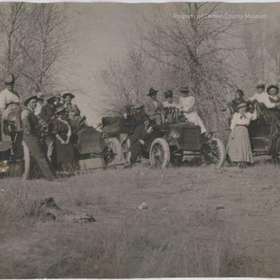 Written on back of original: "October 21 - 1908 Platte River Picnic First 4 automobiles in Rawlins"