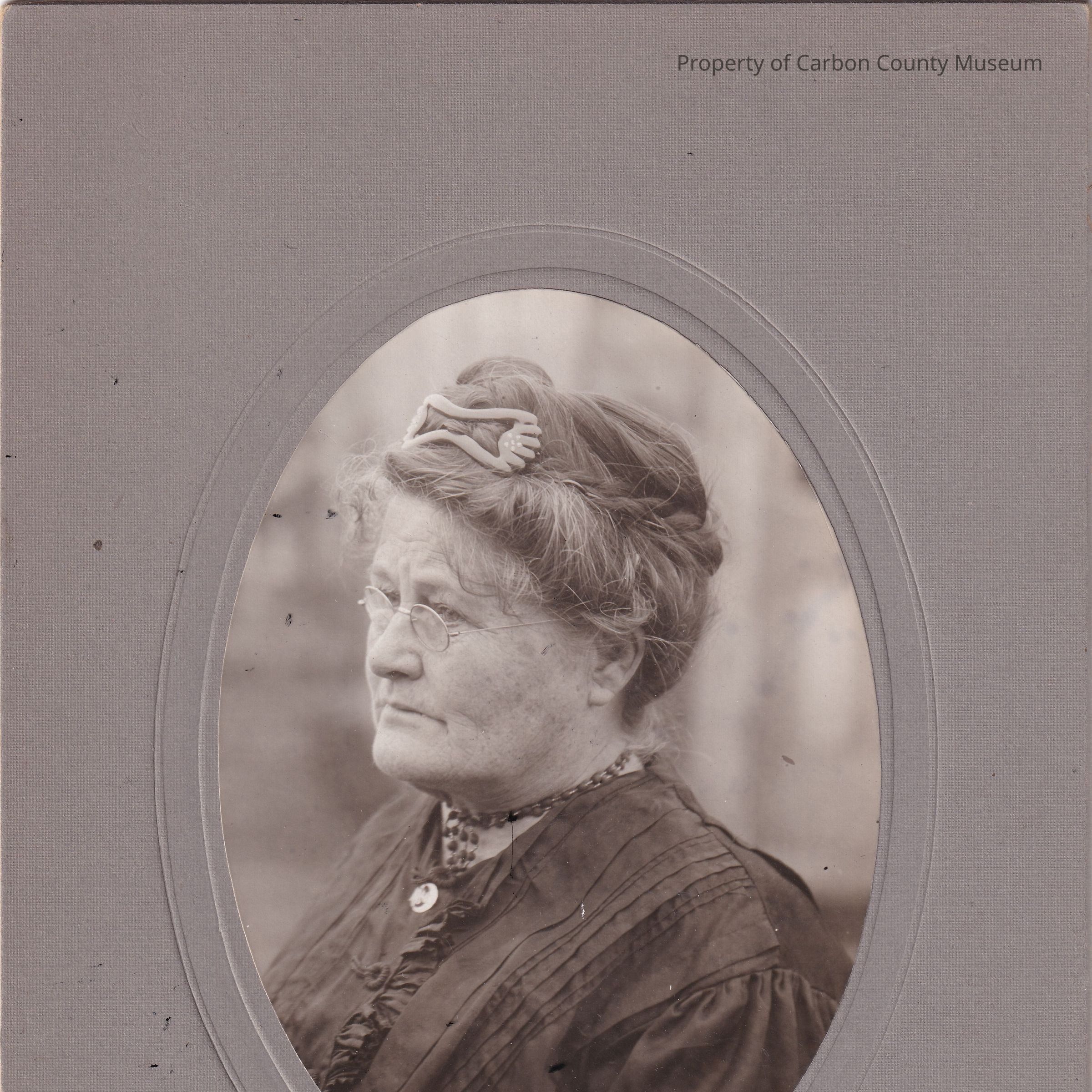 A black and white photograph of an elderly woman, oval pasted onto a grey backing.