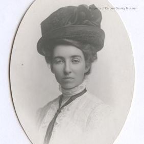 Update - January 2010: Black & white print studio portrait. Oval head & shoulders of a young woman wearing a white blouse/dress with a high collar & eyelet lace ruffles & accents. She wears a dark ribbon(?) necklace & a dark hat; her hair is pinned up.