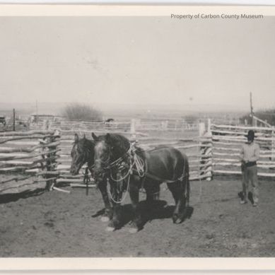 Black & white print. Snapshot. Image of a man & two draft horses inside a corral. Other corrals, trees & hills in background.
