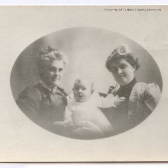 Update 2008: Black and white portrait print of two women in a seated pose and a baby between them. Print is an oval shape printed on ivory colored rectangular photo paper. Woman on left is older and has gray hair in updo, wearing a dark long sleeve dress with high white collar with brooch affixed at neck edge. Baby in center has white long dress type garment on with long sleeves. Lady on right has dark hair in updo with rose on top of drown of hair and is wearing dark turtleneck type blouse and a bolero type jacket with sleeves.