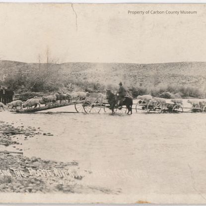Written on back in black ink: "Sheep crossing the Platte River at Ft. Steele, Wyo: