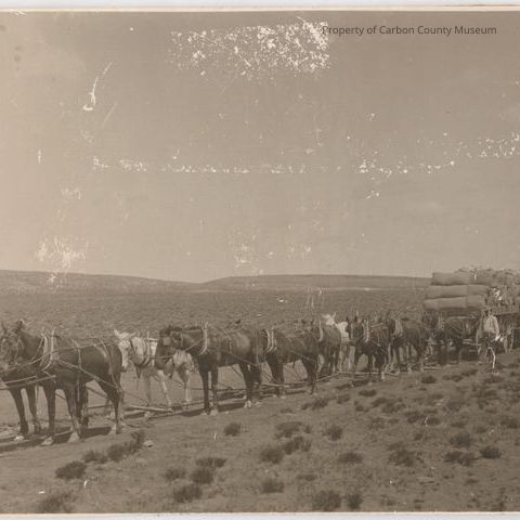 Sepia print. Snapshot. Mounted on tan matboard. Image of wagons with a twelve horse hitch paused on a dirt road. At least two wagons are piled high with large sacks of wool(?); final wagon is a white sheep wagon. Second outfit can be seen in background right; hills & prairie in background. Man standing at front of wagons, large whip over his shoulder.