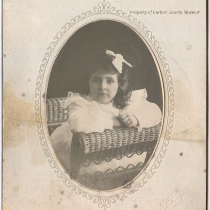 Update 2008: Black and white oval portrait attached to ivory matboard frame of a young girl with dark mid length hair with a white bow on top left crown wearing a white frilly long sleeve dress sitting on a small rattan settee with rolled arms. A printed decorative border surrounds oval on matboard.