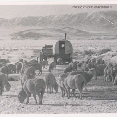 Black & white print. Snapshot. Image of a flock of sheep around a sheep wagon. Horses & second wagon(?) behind & beside sheep wagon. Sagebrush prairie & hills in background. Snow on ground.