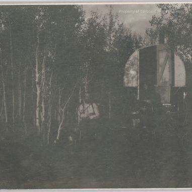 Black & white print. Snapshot mounted on tan matboard. Image of a man and a sheep wagon parked in a grove of trees. Very dark.