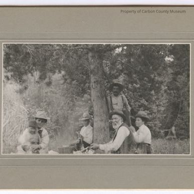 Update 2008: Black and white print attached to medium gray matboard of three women, a young toddler and two men in a wooded and grassy locale. All are sitting on the ground except for a man dressed in dark pants, striped light colored shirt, suspenders, a hat, wearing a mustache, standing against a tree in the center of those seated. Lady on left is holding the toddler. Another lady is propped against base of tree and is holding something in her hand. An older man with full gray beard, wearing vest, white shirt and hat is seated in foreground and holding something in his hands. Another lady is seated behind him and is wearing long sleeve white blouse, medium color hat, and she has her hand lifted in front of her.