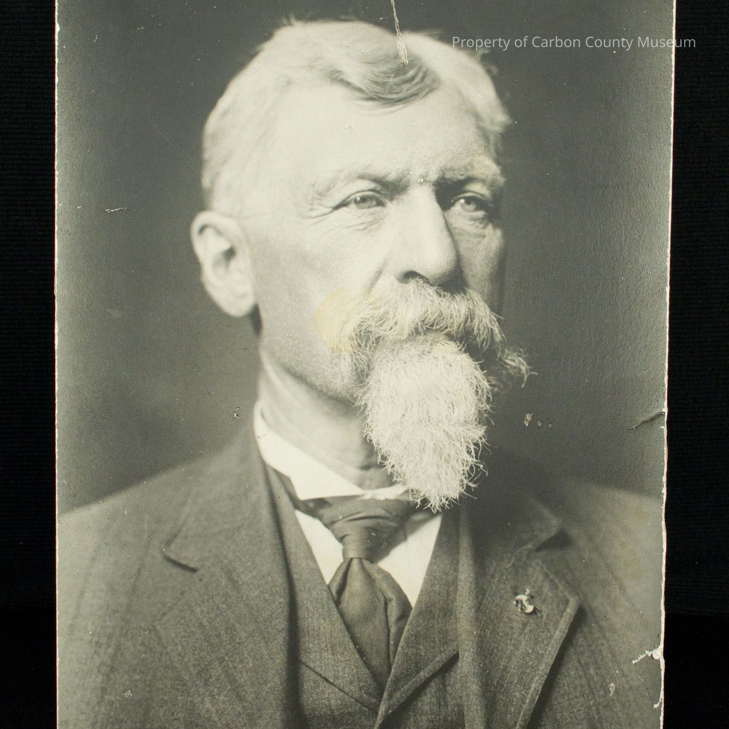 Update - January 2010: A black & white studio portrait of an older man with gray hair & gray Prince Albert type beard & mustache. His eyes are light colored. He is wearing a vest, jacket, white shirt & dark tie with high color at neck. A small lapel pin is seen side right photo.