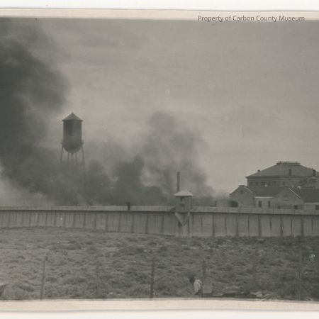 Update March 2011: Black & white print of a tall concrete wall with smoke billowing from inside. A water tower is seen through the smoke. On the corners of the wall are small covered cubicles. On photo right, are the roofs of large buildings with tile roofs & a larger one with a spire. a man stands on the wall & in the extreme foreground is a man in front of a vintage car & the roof of another vintage car.