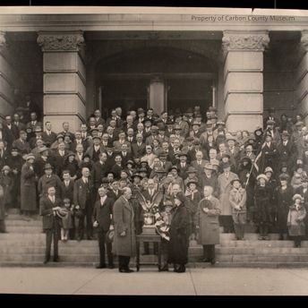 Original #2: 9 5/8 x 14. Written on back in blue ink: "[cut off] receiving the Colliers Trophy - When Nellie Ross was Governor of Wyo. W. W. Daley in the front row checked." Written on the emulsion at the left on the man to left of presentation; he is holding his hat in his left hand.