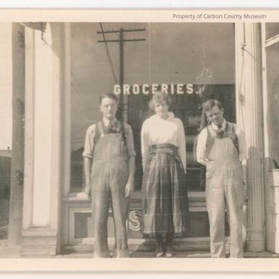 Update 2009: Black and white print. Snapshot. Image of two men and a woman standing in front of a large picture window of a building. "Groceries" painted on window above their heads. Door at right. Men are wearing overalls over their vests, white shirts, and ties. Woman is wearing a dark plaid skirt and white long sleeve blouse.