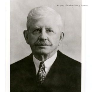 Black & white copy print. Studio pose. Head & shoulders portrait of an older man dressed in a dark suit, dark patterned tie, & white shirt. He has a mustache & a full head of white hair. Painted backdrop behind.