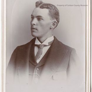 Update 2008: Black and white print attached to white matboard with decorative orange border printed around entire frame 1/16th inch in from outside edge. Photo shows a portrait of a young man with short curly top dark hair wearing a dark jacket, vest and white shirt with high stiff collar with wing tips. A dark patterned tie with tie pin at lower neck edge hangs at an angle around the collar.