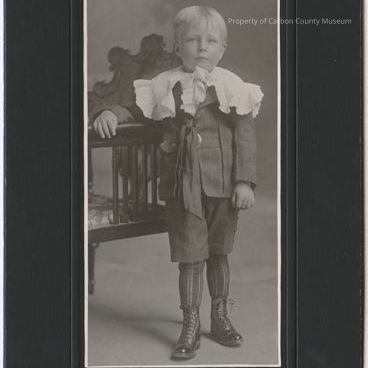 Update 2008: Black and white print attached to black matboard with a fine parallel indented line around print of a young boy with blond hair an light eyes. he is wearing a two piece dark colored suit with short pants with buttons down the leg side seam, striped patterned dark socks and lace up boots. His white shirt has a very large white frilly collar that reaches from outer shoulder to outer shoulder. A dark matching cloth tie hangs down center front. Suit has a sewn in belt closure at waist. His right arm is resting on a settee wooden arm. Matboard border has a grosgrain effect to edges.