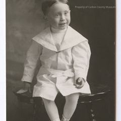 Photo of George Weller, brother of Rhoda Mathieson. Hair parted in middle and dressed in white.