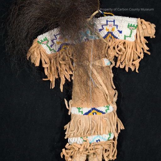 A Cheyenne Native American doll with papoose. The baby doll is wrapped in red trade cloth and suspended from the neck of the "mother" doll by a small leather string. The "mother" doll is wearing a tan leather dress with fringe at sleeves and lower edges. White, blue, green geometric beaded design is at bodice and sleeves. A beaded belt is at waist and two rows of beaded trim is at lower edges of dress. She is wearing beaded moccasins which have upturned toes. The papoose and doll have dark horsehair. The baby's hair is in braids, and the mother's long hair is wildly askew. The doll has a beaded face and long beaded loop earrings in yellow and blue beads. Doll measures 11" tall, and the papoose is 3."Collection