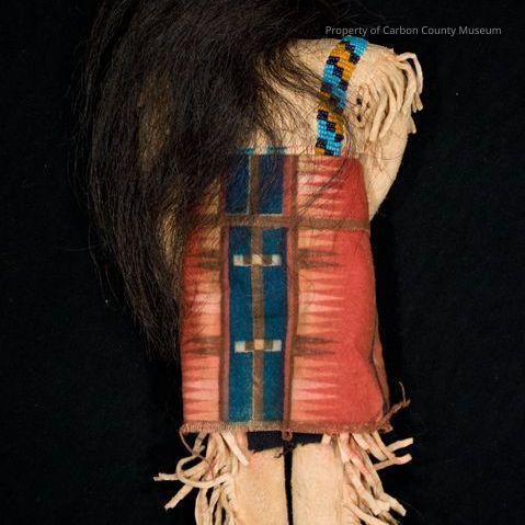 A Blackfoot Native American faceless male doll. The doll's face, shirt and leggings are made from tan suedelike leather. The shirt has fringe at the upper sleeves and is decorated with turquoise, gold and navy beads. A fringed and beaded neck decoration is attached to the shirt. The leggings have a fringe and turquoise beaded design (with geometric areas) at the sides of the legs. He wears a black felt loincloth, covered by a 4 1/4" long piece of a patterned blanket which is earthtone colors. It is wrapped around his lower body. A leather, fringed, beaded pipe bag is attached at his right front area stitched to his hand and the blanket. The moccasins are decorated with turquoise, gold and dark green beads. His dark horse hair is long and unkempt.